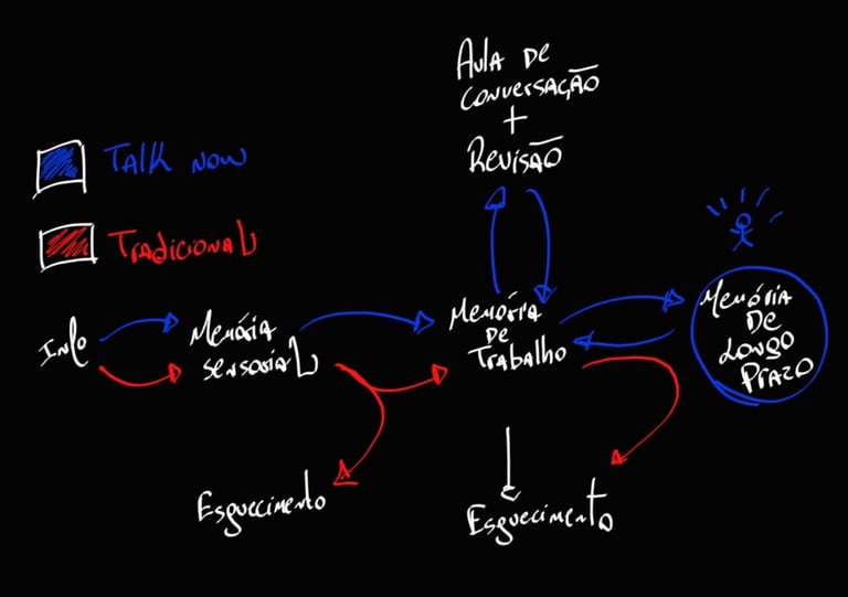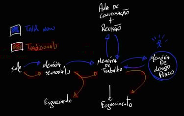 O Jeito Talk Now: Nós combatemos a curva do esquecimento com estratégia. Você recebe materiais complementares (para facilitar a absorção) e é orientado a praticar na mesma proporção — ou até maior — ao tempo de teoria. É essa prática transforma a simples informação em conhecimento, contando ainda com um sistema de revisões para fixar tudo na memória de longo prazo e usar quando necessário.
